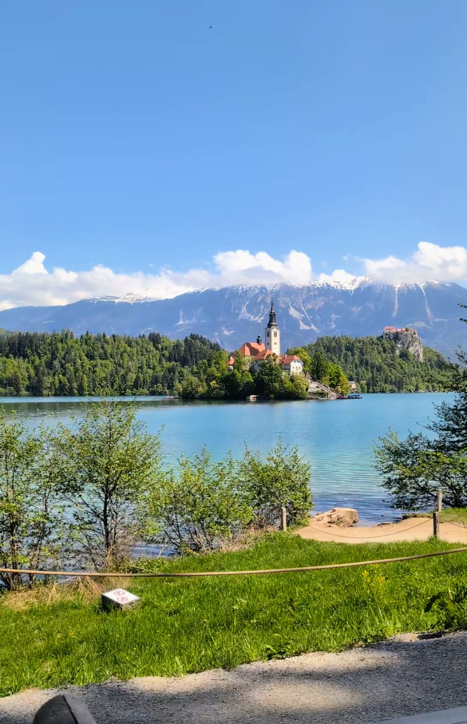 「アルプスの瞳」とも称され、湖に浮かぶ小島の教会、断崖の上に立つ城が絵画のよう🏰