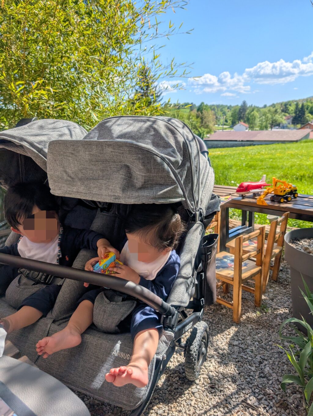 双子たちは足だけ川に浸かってパチャパチャ水遊び。冷たくて澄んだ水。