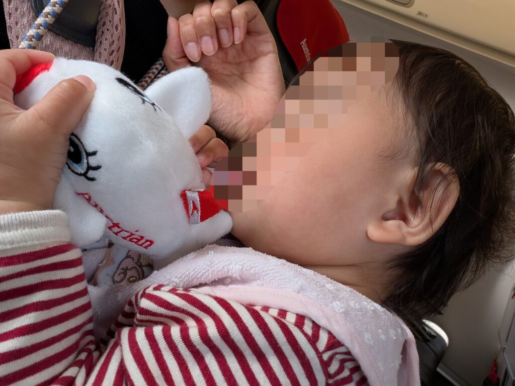 機内では子どもたちに飛行機のぬいぐるみをプレゼントしてくれて、双子は大喜び🥰